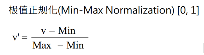 所以首先我们先要对变量中的属性进行极值正规化,进行计算的公式也很简单,就是(原始值-该属性中的最小值/属性中的最大值-最小值)如下图所示。