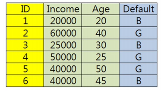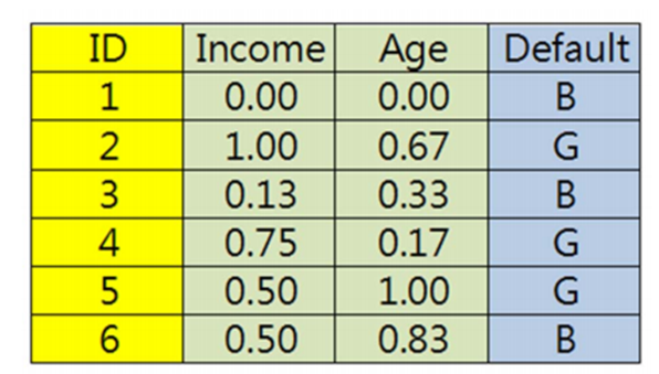 另外把K最近邻算法归入到基本的数据挖掘技术,是因为KNN本身并不是一个可以自行学习的算法,它只是机械的计算与周围邻居的距离,所以这个算法本身的效率比较低。比如最开始的数据集有100万条,对于一条待分类的数据,KNN会计算所有100条数据的距离,在进行排序,取前k个邻居,再进行类别判断。对于下一条待分类的数据也是如此计算。我们在对实例实施K最近邻的算法之前,首先要注意,我们需要对数据的量纲进行处理。K最近邻算法主要计算实例间的距离远近,如果实例中的变量单位不同或者量纲差别很大,会影响到距离计算的结果。如下图所示,Income的单位是万,而Age的单位是十,如果在单位量纲不变的情况下直接计算距离,由于这两个属性的量纲差距很大,Age这个单位量纲较小的属性在距离计算中的权重太小,甚至被忽略,这个情况显然不是我们所期望的。