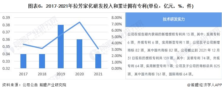 2017-2021年,拉芳家化的研发投入金额总体呈现波动状态,2021年,拉芳家化的研发投入金额为0.34亿元,占营业收入占比为3.12%,相较于往年有所下滑。截至2021年末,公司新增授权专利共13项,其中:发明专利6项,外观专利6项,实用新型专利1项;公司及子公司新增商标82项,其中国内商标82项。公司截止到2021年12月31日现有的授权专利共139项,其中:发明专利74项,外观专利64项,实用新型专利1项;公司及子公司的商标总共825项,其中国内商标761项,国际商标64项。