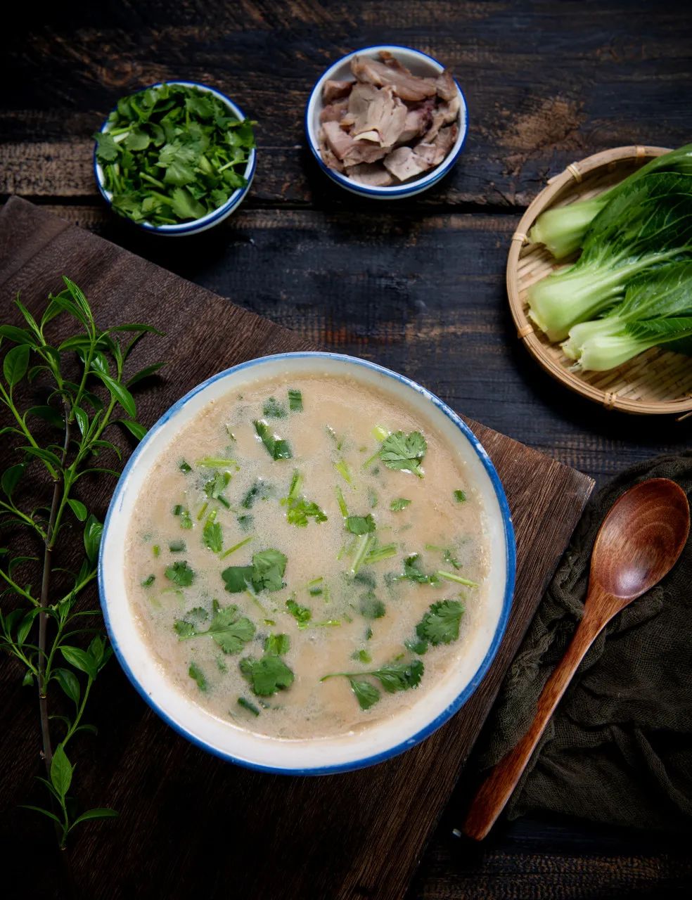一般说来,山羊膻味大,尤其以公山羊更膻。但本溪羊汤往往会特地挑选公山羊,宰杀后以柴火熬到汤底雪白、肥油融化、瘦肉酥烂。吃的时候要连羊杂、羊肉一起,打满满一碗。高粱面饼子是发面烙熟的,既松脆,又酥软,和烘烤的小麦面饼有了很大差异。显然,一条慢慢脱离烧烤烘焙,制作工艺越来越精细复杂的羊汤脉络,已经可以管窥。