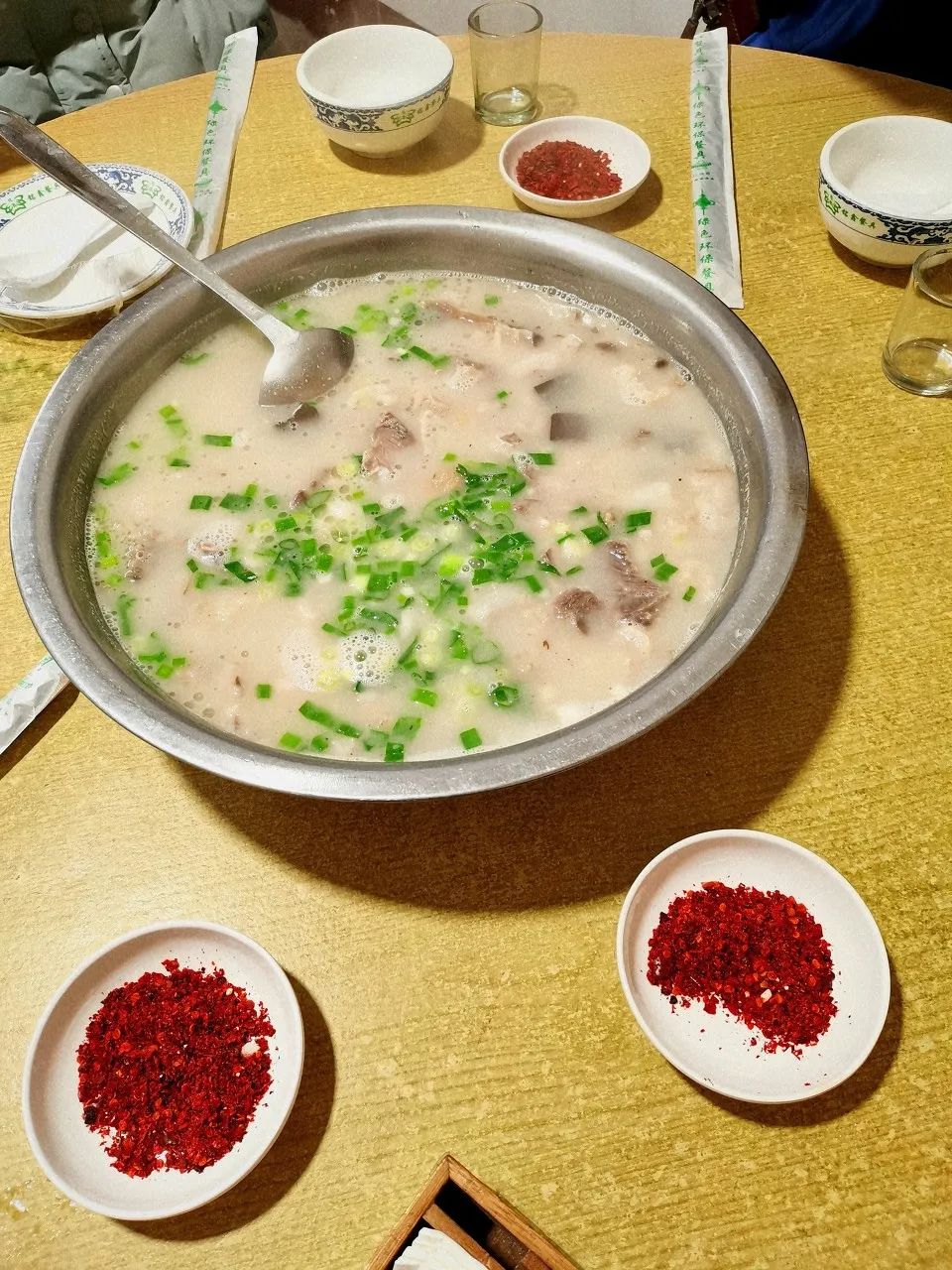 今天,在西北的许多地方,依然保存着最中国古老的羊汤样式。比如内蒙古西部的羊杂汤,要和一种特殊的点心“焙子”搭配食用。对草原儿女来说,大块的羊排是要待客,以及正餐食用的,剩下部分,经由长时间熬煮,在小葱、辣椒油的点缀下,鲜香扑鼻。