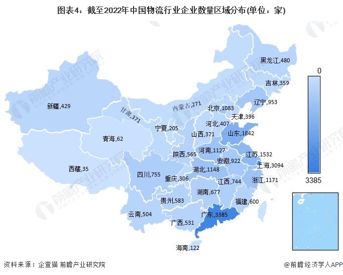 根据中国企业数据库企查猫,目前中国物流行业企业主要分布在长三角和珠三角等地,特别以广东省和上海市为代表。截至2022年6月29日,广东省共有相关物流行业企业数3385家,上海市则有3094家。
