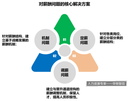 华恒智信专家老师在长期开展薪酬激励咨询项目的过程中,注意到很多企业在从创业期过渡到规范管理期的时候,由于过去的管理习惯的影响、领导认知的问题,导致改革成效不大。为了加强管理,很多企业都希望彻底抛弃原有的办法,重新建立新的规范化体系,但是在实际使用中,由于和现实脱节而无从下手。华恒智信项目组建议,薪酬改革是较为敏感的问题,需要结合实际情况逐步调整。落实到该公司,需要对公司各类岗位建立符合公司未来发展要求的薪酬激励体系,体现战略引导,就要打好基础、结合现状建立调整办法,从而用2-3年的时间,逐步将薪酬管理实现规范化。具体的解决方案如下: