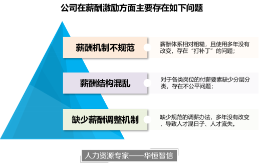 针对该公司的问题,华恒智信老师组成专业项目组,深入该公司开展了一系列调研访谈工作,并调研了国家对医药方面的具体政策要求,发现该公司和大多数民营企业的发展路线相似,在技术优势的支撑下,度过了创业阶段,在公司体量扩大的时候,即将进入下一个规范化管理阶段。而在此阶段,公司原有的简单的管理机制无法支撑进一步发展,需要通过深化改革、精细化管理,促进公司进步。通过调研,华恒智信项目组发现,目前的公司在薪酬激励方面主要存在如下问题: