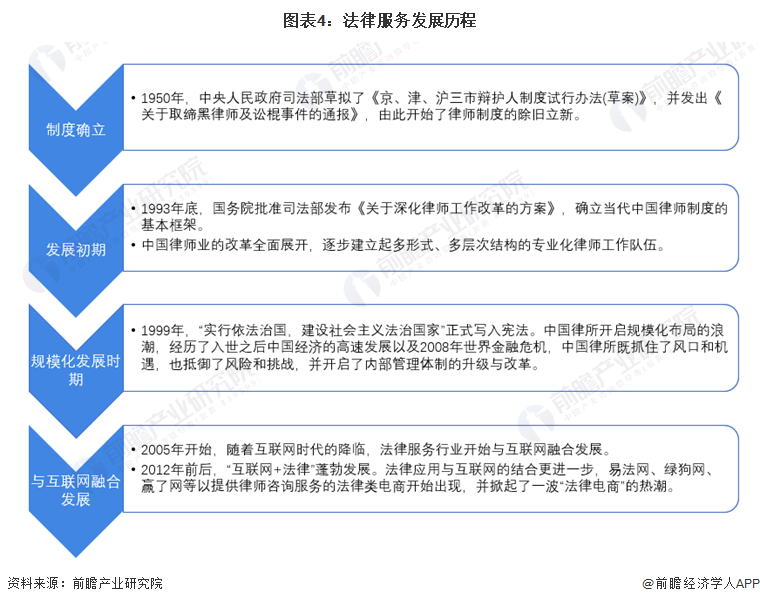 从1950年律师制度确立开始,中国法律服务行业开始进入规范化发展正轨。行业发展经历了两个重要阶段,分别是1993年国务院批准司法部发布《关于深化律师工作改革的方案》标志着法律服务行业专业律师工作的开始;2005年互联网+法律服务行业的融合发展开端。