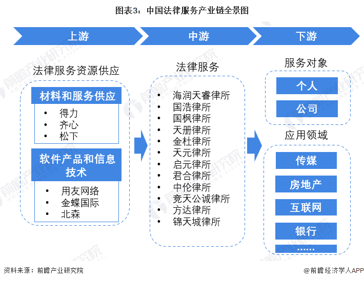 目前,我国法律服务行业山上游主要包含法律服务资源供应,具体包含材料和服务的供应以及软件产品和信息技术的供应。而行业中游法律服务行业包含诉讼服务和非诉讼服务两个细分领域,其中,诉讼领域主要有民事案件代理、经济案件代理、行政案件代理、申诉案件代理、刑事案件代理;而非诉讼服务主要有法律顾问、法律咨询、证券类律师代理、公司类律师代理、代理法律事务文书、出具法律意见书和基层法律服务。行业下游主要对接服务对象,如个人委托或者公司团体进行服务委托。