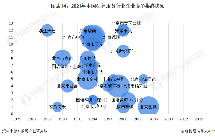 依据中国法律服务行业律师事务所有关法律服务的年业务单数以及竞争者入场进程,目前,中国法律服务行业中,北京市中伦、上海市锦天城、北京国枫、北京市金杜律师事务所的业务单数超过了其他竞争者,处于我国竞争力较强梯队当中。从企业入场进程来看,我国法律服务竞争者集中在1990-2003年之间成立;例如北京金杜、上海市锦天城这种大型企业均在该时间段成立。
