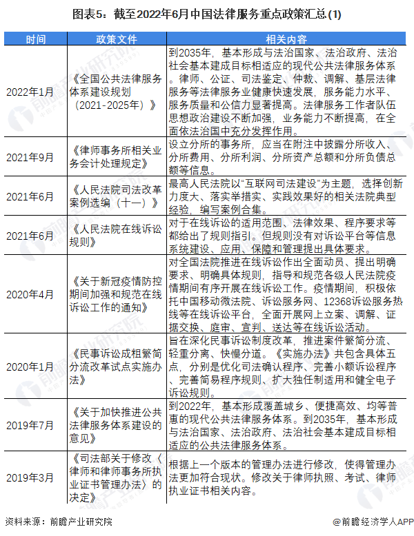 截至2022年6月,中国法律服务行业政策主要围绕公共法律服务体系建设以及互联网时代下线上平台建设。目前,公共法律服务体系的建设及完善是法律服务行业的重要环节,国家持续出台政策进行指导和规范,如2022年1月的《全国公共法律服务体系建设规划(2021-2025年)》、2019年7月的《关于加快推进公共法律服务体系建设的意见》以及2017年8月的《关于推进公共法律服务平台建设的意见》。