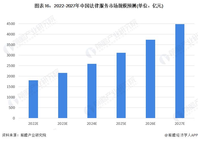 根据中华全国律师协会的信息,在未来几年内,中国法律服务行业总体市场规模实现将稳步增长。据此,假设未来市场规模增速保持20%,则2022-2027年中国法律服务行业市场规模逐年上升,且2027年市场规模接近4500亿元。