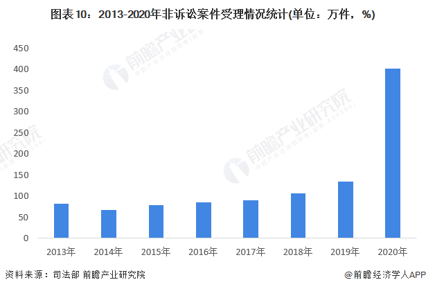 据司法部统计数据显示,2013-2020年我国非诉讼案件的受理数不断增加,2020年达到约402万件,同比增加200.52%。
