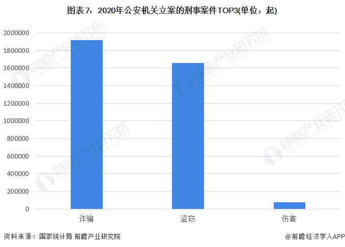 目前,我国公安机关立案的刑事案件数量约为478万起,相较于2019年同比下降1.68%;其中我国刑事案件中诈骗案最多,2020年达到约192万起,占刑事案件总数约40%;其次为盗窃案,2020年为166万起,约占刑事案件的35%。而伤害案件占比仅为约2%。综合来看,公安机关立案事件中诈骗、盗窃占比较高。