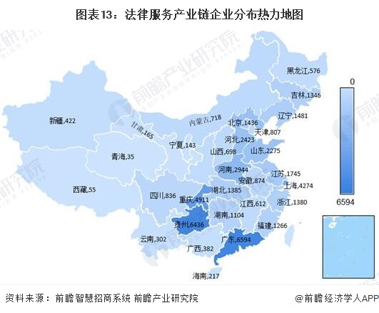 从我国法律服务产业链企业区域分布来看,广东省是法律服务产业的集聚地,不论是经营企业还是上市企业数量均是全国首位。其次贵州、重庆、上海、山东、河北等地区的法律服务企业分布数量亦较多。