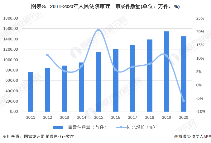 2011-2020年,我国人民法院审理一审案件的数量先上升后下降。我国人民法院审理一审案件数量先上升至近五年最高值2019年的1543.96万件,同比上升约10.91%;到2020年,人民法院审理一审案件数量略有下降,为1451.85万件,同比下降约5.97%。