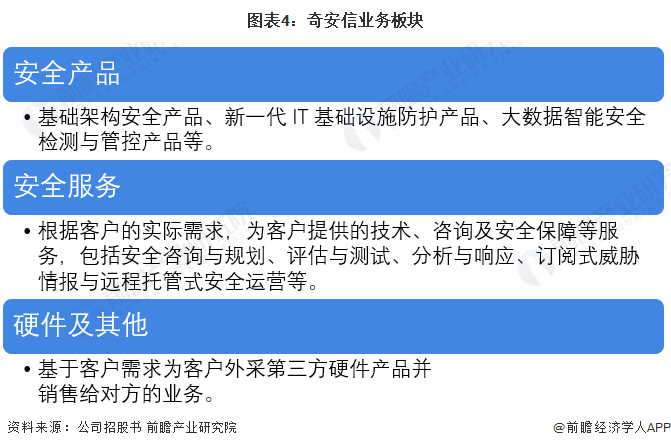 具体业务来看,奇安信的业务主要分为网络安全产品、网络安全服务和硬件与其它业务三大业务板块。
