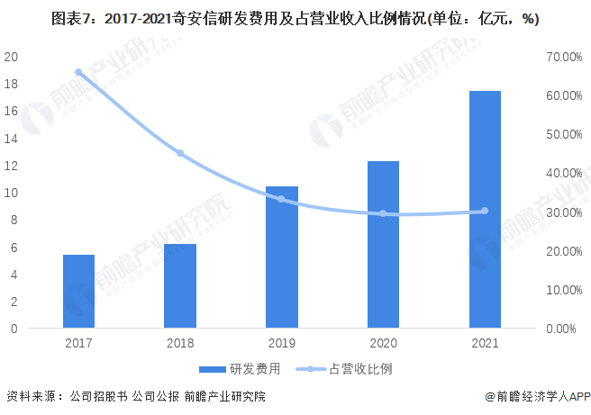从研发费用角度来看,奇安信的研发投入金额大、持续性强。根据公司的招股说明书和年报的数据,2017-2021年,奇安信的研发费用不断增长,从2017年的5.41亿元上升至2021年的17.48亿元。