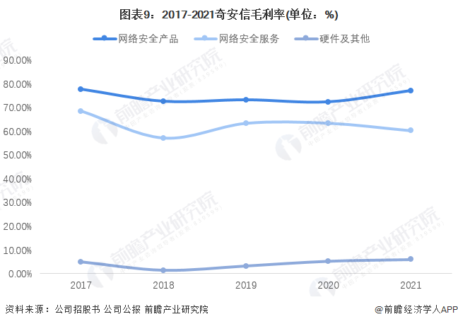 在毛利率方面,奇安信网络安全产品与网络安全服务的销售毛利率一直维持在较高水平。2021年,产品与服务的毛利率分别为77.02%和60.13%。
