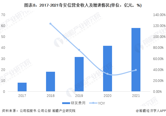 从营业收入角度来看,2017年来,奇安信的营业收入水平增速较快,其中2017年时的增速甚至超过了100%。2021年全年,奇安信整体营收57.81亿元,同比增长38.93%。
