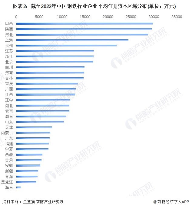 根据中国企业数据库企查猫,目前中国钢铁行业企业的平均注册资本区域分布中,山西省相关企业的平均注册资本最高为29727万元,除此外,陕西省和河北省的钢铁行业企业平均注册规模均在25000万以上,规模相对较大。