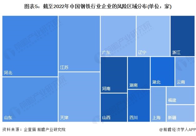 根据中国企业数据库企查猫,目前中国钢铁行业企业主要分布在东南沿海城市和珠三角等地,特别以山东省和江苏省为代表。截至2022年6月29日,山东省共有相关钢铁行业企业数1610家,江苏省则有1330家。