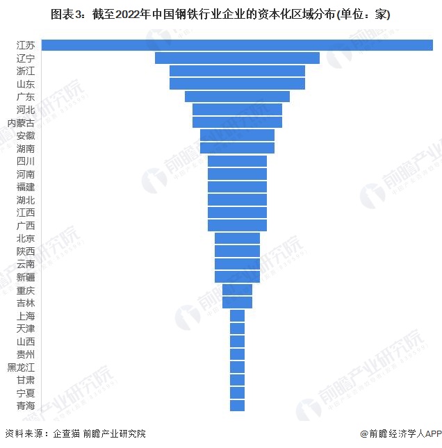 根据中国企业数据库企查猫,目前中国钢铁行业资本化的企业(有融资信息和上市信息)的主要分布在江苏省和辽宁省等地。截至目前,江苏省共有存续和在业的资本化企业共计26家,辽宁省为11家。