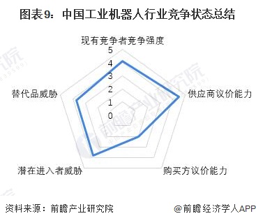 运用波特的“五力”模型,对服务机器人行业的竞争环境分析中,对各方面的竞争情况进行量化,5代表最大,0代表最小,服务机器人行业的竞争情况如下图所示:综合来看,我国工业机器人购买方议价能力较弱,供应商议价能力较强,现有竞争者较多,具有一定的潜在进入者威胁。
