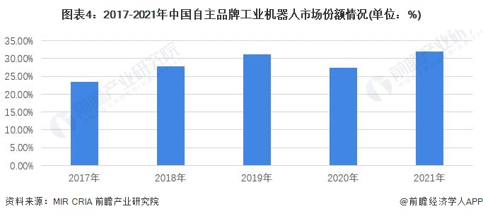 虽然我国工业机器人市场目前仍以外资品牌机器人为主,但近年来,随着我国在机器人领域的快速发展,我国自主品牌工业机器人市场份额也在逐步提升,与外资品牌机器人的差距在逐步缩小。2020年疫情的影响,外资机器人品牌更加注重中国市场,在国内推行定向降价策略,提高产品竞争力,国内品牌价格优势削减,市场份额出现下滑。2021年中国工业机器人市场份额有所提升,超过32%。