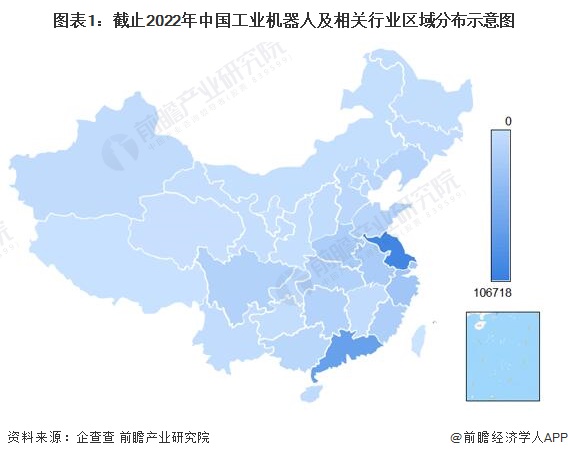 中国工业机器人企业分布较为集中,在华东华南沿海等地区均有分布。目前江苏地区的企业最多,企业接近110000家,为全国注册企业最多的区域。从整体上,大多企业也聚集在东部沿海区域。