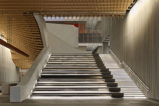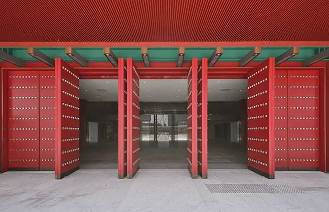 来到香港故宫,首先映入眼帘的是10扇朱红色的迎宾门,每扇门分布9行9列81个玻璃门钉,外墙则采用数千块不规则的金色铝板拼接,辅以玻璃幕墙和渐变铁饰面板。