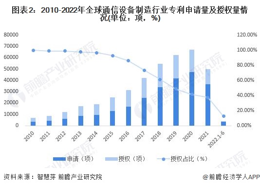 截至2022年6月16日,全球通信设备制造行业专利申请数量3530项,专利授权数量444项,授权比重为12.58%。