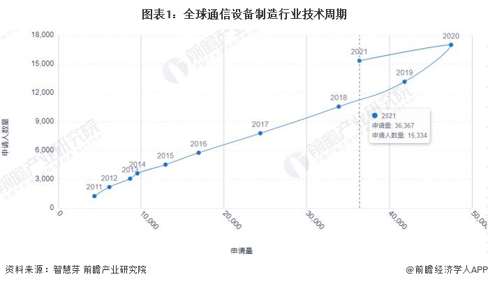 2011-2020年,全球通信设备制造行业专利申请人数量及专利申请量均呈逐年递增趋势。虽然2021年全球通信设备制造行业专利申请人数量及专利申请量有所下降,但是这两大指标数量仍较多。整体来看,全球通信设备制造技术处于成熟期。