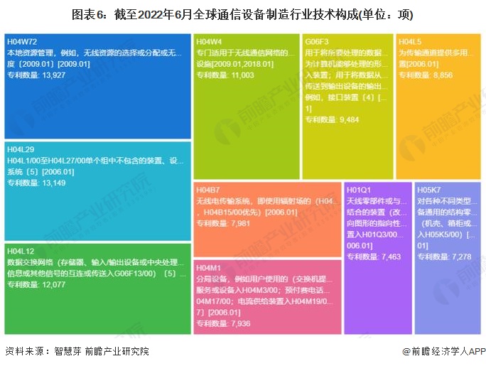 从技术构成来看,截至2022年6月16日,“H04W72 本地资源管理,例如,无线资源的选择或分配或无线业务量调度〔2009.01〕[2009.01]”的专利申请数量最多,为13927项,占比14.05%;“H04L29 H04L1/00至H04L27/00单个组中不包含的装置、设备、电路和系统〔5〕[2006.01]”专利申请数量次之,总计13149项,占比13.26%;“H04L12 据交换网络(存储器、输入/输出设备或中央处理单元之间的信息或其他信号的互连或传送入G06F13/00)〔5〕[2006.01]”和“H04W4 门适用于无线通信网络的业务;设施[2009.01,2018.01]”排名第三和第四位,专利申请数量分别为12077和11003项,占比分别为12.18%和11.10%。其他通信设备制造技术占比均小于10%。