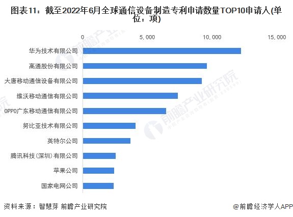 截至2022年6月16日,全球通信设备制造行业专利申请数量TOP10申请人分别是华为技术有限公司、高通股份有限公司、大唐移动通信设备有限公司、维沃移动通信有限公司、OPPO广东移动通信有限公司、努比亚技术有限公司、英特尔公司、腾讯科技(深圳)有限公司、苹果公司和国家电网公司。