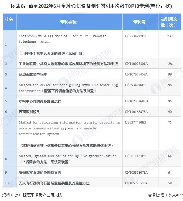 Intercom/wireless door bell for multi-handset telephone system(用于多手机电话系统的对讲/无线门铃)(专利号:US7738917B2)和工业物联网中具有大数据集的数据收集环境下的检测方法和系统(专利号:CN110073301A)是被引用次数最多的两大通信设备制造专利,两者被引用次数均超过190次。截至2022年6月16日,全球通信设备制造行业被引用次数前十大专利如下所示: