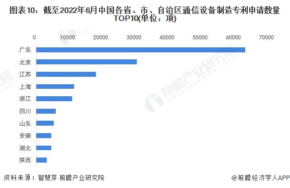 中国方面,截至2022年6月16日,广东省为中国当前申请通信设备制造行业专利数量最多的省份,累计通信设备制造行业专利申请数量达63201项,占全国通信设备制造行业专利申请数量前十名总量的39.94%;北京市和江苏省的通信设备制造行业专利申请数量分别为30394项和18175项,分别占全国通信设备制造行业专利申请数量前十名的19.21%和11.49%。中国当前申请省(市、自治区)通信设备制造专利数量排名前十的省份还有上海、浙江、四川、山东、安徽、湖北和陕西。