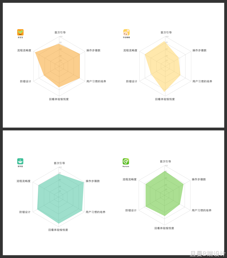 我们可以将它运用到互联网产品用户体验分析上,用图示化的方式对竞品多个维度的优势、劣势作出直观的展示。