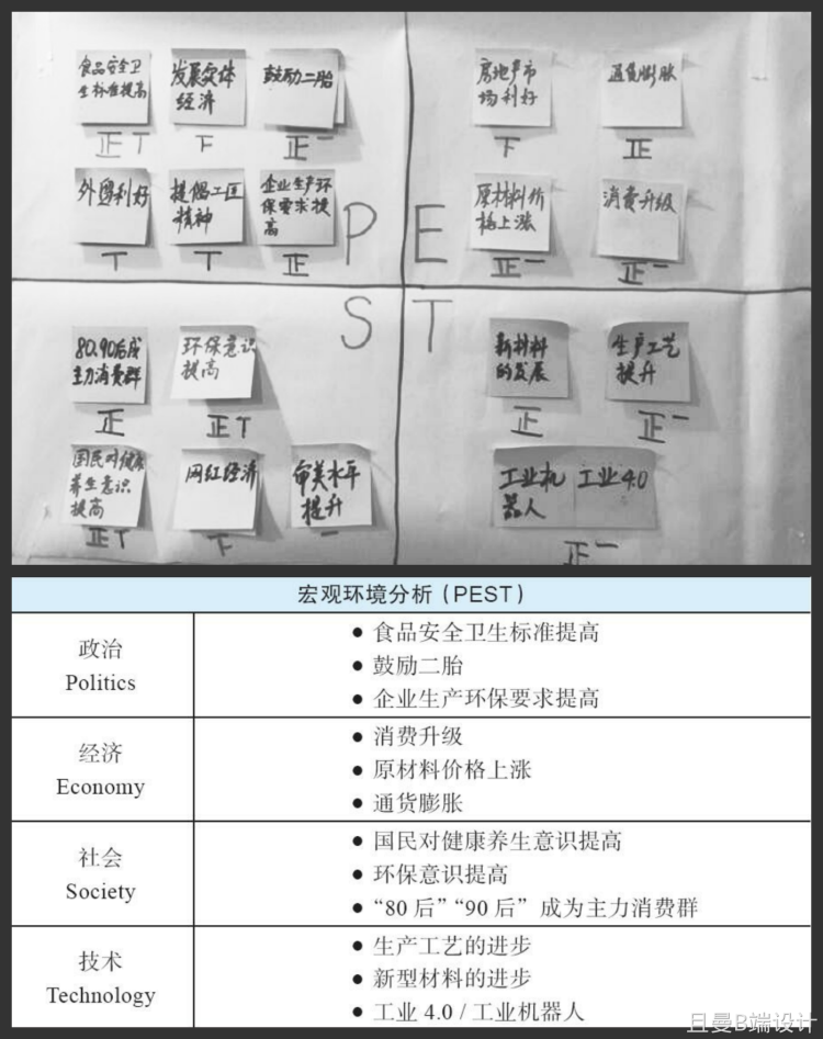 第二步:团队成员都静默思考,参考 PEST 分析的框架,尽可能多地罗列出与产品有关的环境因素,写在便利贴上,每张便利贴写一个点子
