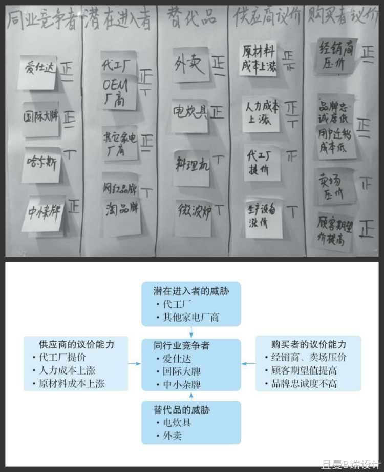第三步:团队成员都静默思考,参考波特五力模型的框架,找出行业内的重要竞争力量(同行业竞争者、潜在 进入者、替代品、供应商、购买者),写在便利贴上,每张便利贴写一种竞争力量。
