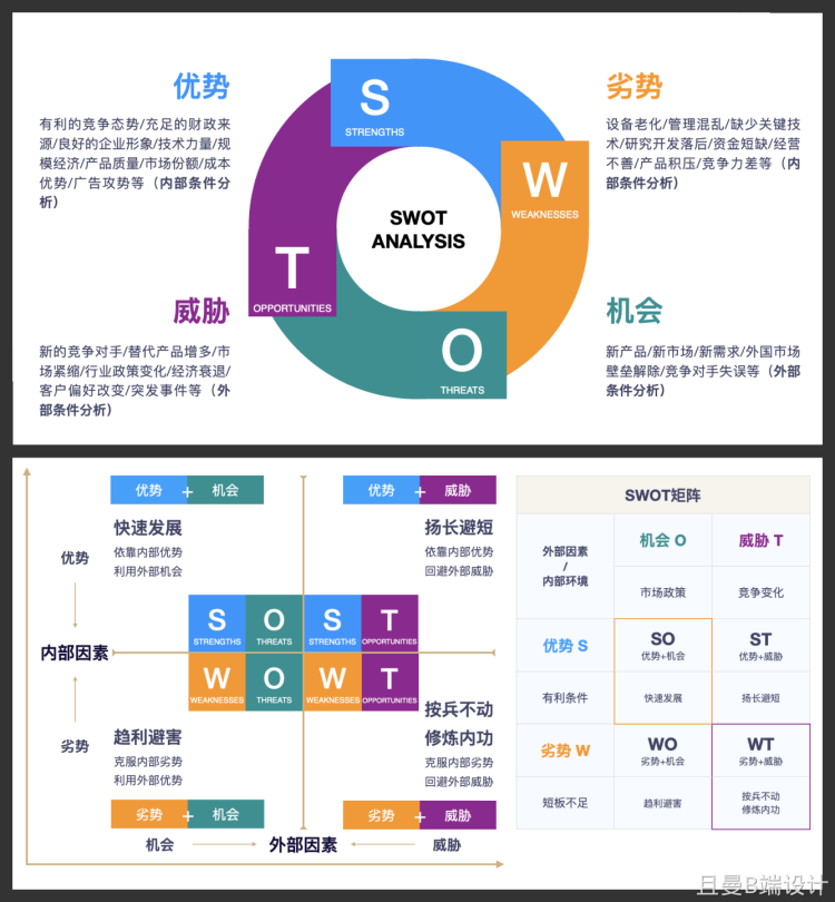 优点:通过 SWOT 分析,可以帮助企业把资源和行动聚集在自己的强项和有最多机会的地方,并让企业的战略变得明朗,同行可以与其他的市场分析工具结合使用。