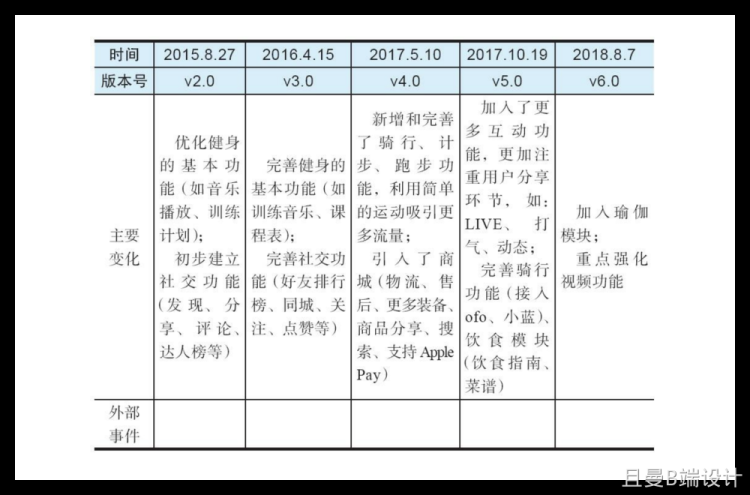 第二步:绘制竞品跟踪矩阵按照时间线,对竞品的各个版本变化情况进行跟踪,记录版本号以及该版本的变化情况,比如:新增了哪些功能、优化了哪些功能、删除(弱 化)了哪些功能等。同时,对外部环境的变化情况也要做好标记(例如,产品相关的政策、经济、技术、行业环境的变化),结合竞品的版本变化情况做进一步的分析解读