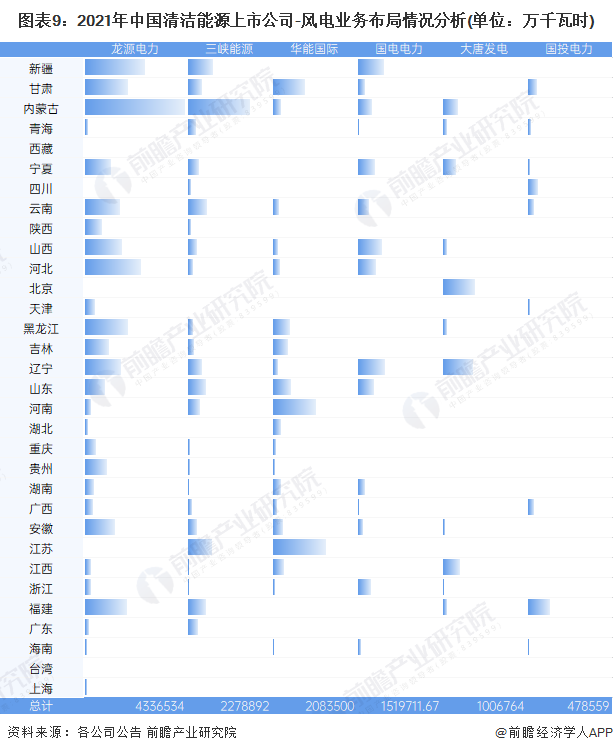 清洁能源企业业务布局受到资源禀赋、环境条件以及装机成本等因素影响。在主要上市企业中,龙源电力和三峡能源清洁能源分布广泛,基本采取风光并举、海陆统筹、多元发展的战略。