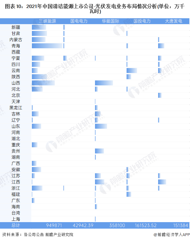 注:上图根据各公司公报统计2021年全国各省发电量,值域为0到五家企业中分省最大发电量,龙源电力未公布光电分省发电量数据,故不列入对比;上表将大唐发电统计京津冀发电量并入北京地区。