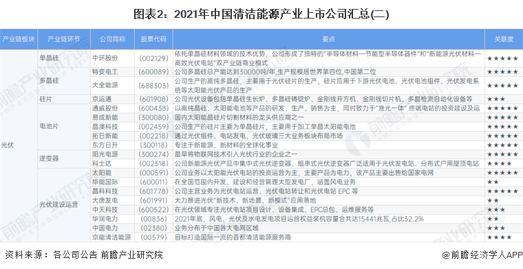 注:由于部分企业多元化经营,涉及多种清洁能源产品的生产、销售和应用,上表不在细分领域重复列述,企业关联度综合评估上市公司在该产业链板块中的行业地位、技术水平、业务占比及整体清洁能源业务的发展等因素,仅供参考,下同。