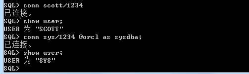 如下图所示 通过 conn user/password @database 来切换登录用户,然后使用show user;命令查看当前的登录用户。