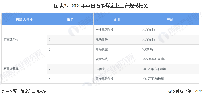 目前,我国石墨烯产业已经有超过50家的制备及相关应用开发企业,目前市场竞争也主要集中在石墨烯规模化制备技术以及与下游商业化应用对接两方面。经过前期的积累,国内大型石墨烯企业已经初步掌握了国际相对主流的石墨烯制备方法,大部分指标足以满足低端应用需求。此外,少数企业已经具备了规模化生产的优势,产能扩建也在进行之中,市场竞争愈发激烈。其中宁波墨西科技、凯纳股份与青岛昊鑫三家企业石墨烯粉体产量位居国内前三,石墨烯薄膜行业领先企业有碳元科技、墨希科技与贝特瑞等