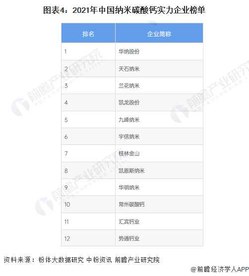 目前,新材料产业迅速崛起,产业链上下游结合愈发紧密,纳米碳酸钙企业对国外引进工艺的本土化改造和自主研发水平越来越高,技术先进的纳米碳酸钙企业数量逐渐增加。例如,国内的动态陈化技术、多级碳化技术、多元形貌/粒径控制技术、纳米级表面改性技术、粉体表征技术越发成熟,40nm以下的活性产品逐步实现产业化,40-100nm的活性产品已经多点开花,实现了多产地、多应用,多产能的全新局面,根据中国粉体网公布份额行业内实力企业名单如下: