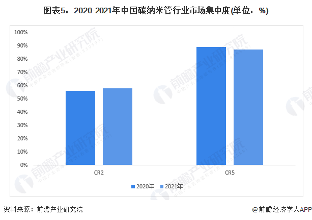 目前,中国纳米材料的整体市场的集中度较低,企业众多,产品竞争较为激烈,部分细分领域产品龙头企业竞争优势明显,市场集中度较高,如碳纳米管行业,2020-2021年CR2都在55%以上,CR5均在85%以上,随着市场竞争的愈发激烈,市场CR5有所下降。