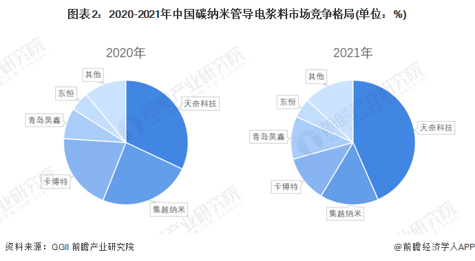 从碳纳米管行业竞争格局来看,天奈科技在碳纳米管行业地位稳固。根据GGII数据,2021年国内碳纳米管导电浆体行业中天奈科技出货量多年蝉联第一,市占率超40%,主要是供应高端锂电池市场,与2020年市场份额相比,占比大幅提高;位居第二的集越纳米2020年市占率为23.8%下降至2021年的15%左右;卡博特位居第三,2021年市场占比为20%,大幅下降。海外企业中卡博特收购三顺纳米切入该领域,LG化学依托自身化工优势自研。