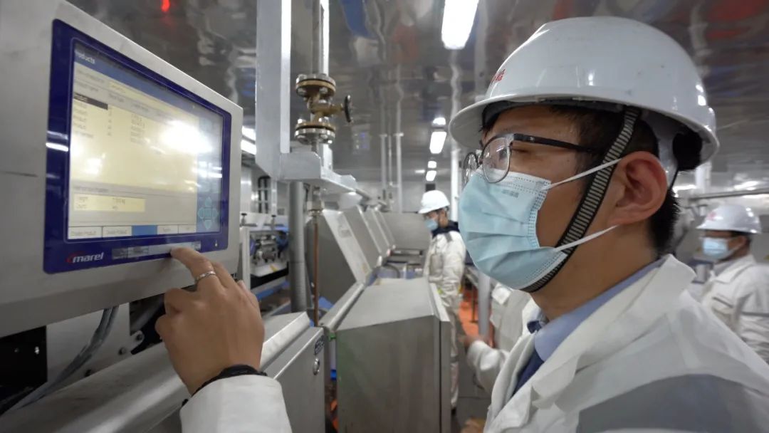 船上暗藏玄机。工作人员紧张地盯着屏幕,各类机械忙碌不停:吸鱼、预冷、分拣、冰鲜等一道道工序如流水线般穿梭不停,仅需45分钟,即可将起捕的大黄鱼装箱运出;另一边,家住陕西省的毕女士正在短视频平台上轻点“小黄车”。
