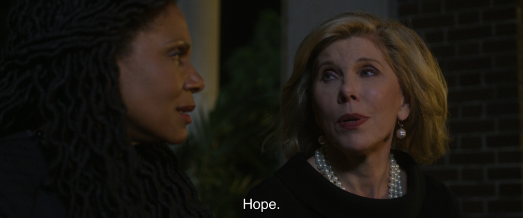 所有人都要在道德模糊的不同边界寻找平衡点,历经种种挣扎,竭力靠岸,才是「战」最险要,也最显耀的所在。因此,他们身上,必然背负着主创,或者说正道,对观众某种愈发迫切的期待。毕竟我们完全可以把《傲骨之战》,当作是现实世界的镜像,乃至进行时的寓言或预言。于是非常突出的是,除了即时写就的案件具有现实性乃至前瞻性,《傲骨之战》本身的大背景,越来越映照当下世态。最有标志性的一回,乃是当年特朗普当选,以戴安为首的主要角色激发创伤式的悲愤与绝望,顺应了美国主流艺术创作的哀鸿一片。