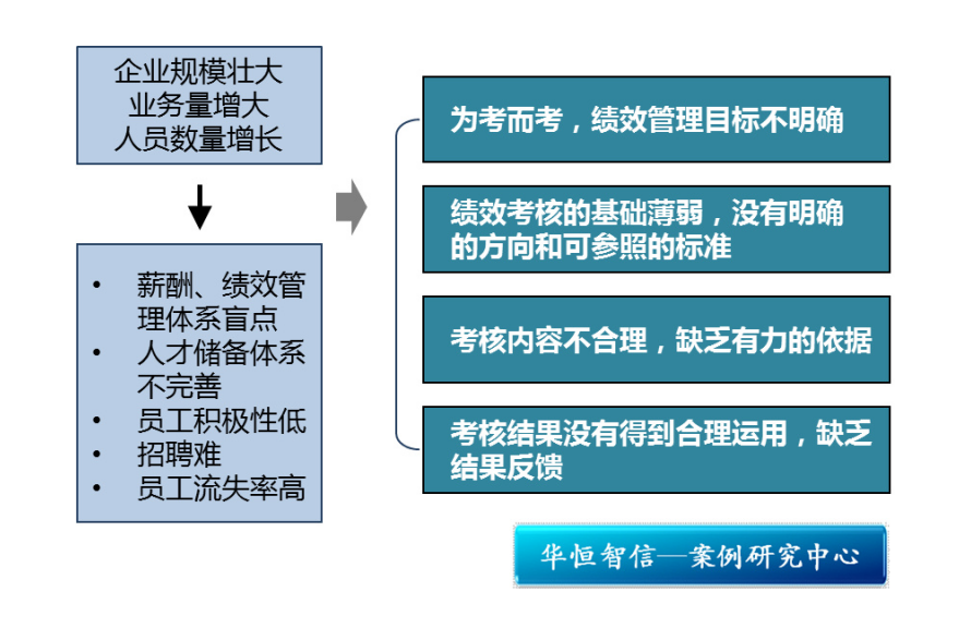 随着企业规模的扩大,员工数量不断增加,与之相关的人事管理工作的复杂性也随之增大。但是由于行业的特点,该购物中心的人员整体素质偏低,且自成立以来,该中心重经营轻管理,其人力资源管理水平也有待提升。在这样的背景下,该购物中心领导邀请华恒智信进驻企业,帮助企业诊断人力资源管理方面的问题,并提出对应的解决方案。
